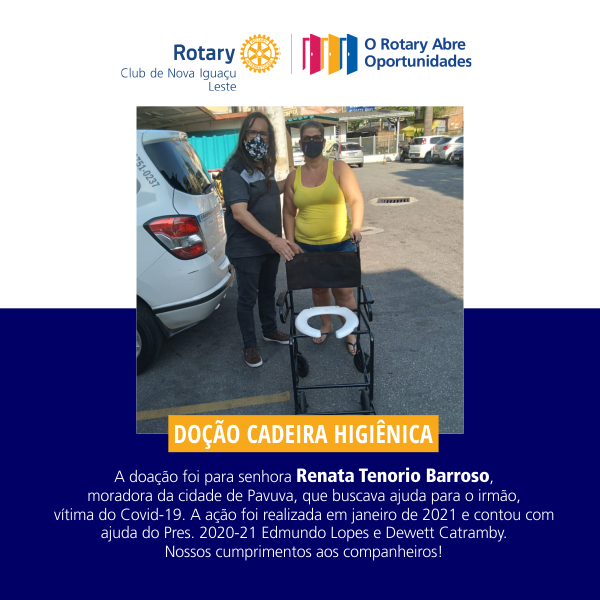 A doação foi para senhora Renata Tenorio Barroso, moradora da cidade de Pavuva, que buscava ajuda para o irmão, vítima do Covid-19. A ação foi realizada em janeiro de 2021 e contou com ajuda do Pres. 2020-21 Edmundo Lopes e Dewett Catramby.