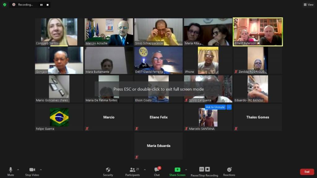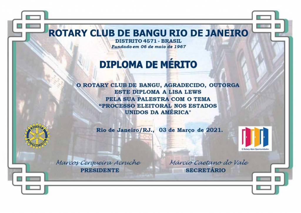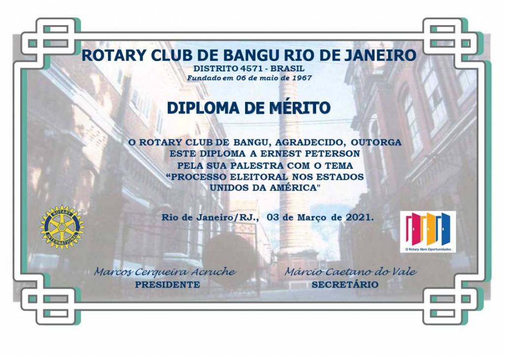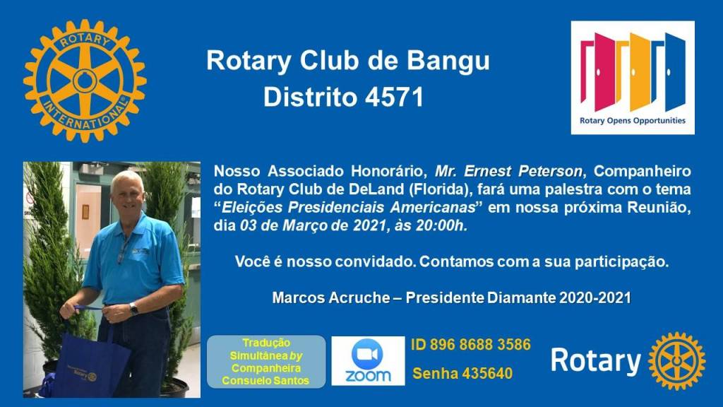 O Rotary Club de Bangu recebeu ontem, em sua reunião virtual (plataforma zoom), seu Associado Honorário, Mr Ernest Peterson, companheiro do Rotary Club de DeLand - Florida para uma palestra com o tema "Processo Eleitoral nos Estados Unidos da América".