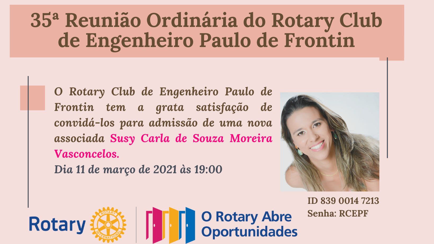 O Rotary Club de Engenheiro Paulo de Frontin tem a grata satisfação de convidá-los para admissão de uma nova associada Susy Carla de Souza Moreira Vasconcelos. Dia 11 de março de 2021 às 19:00'.