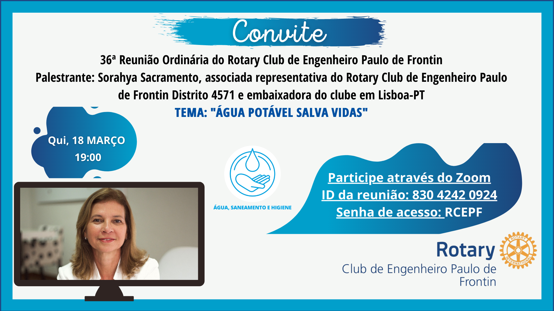 Historicamente, desde meados de 1950, o Conselho Administrativo progressivamente designa um determinado tema para cada mês do ano com o propósito de criar um calendário rotário que permite dar destaque e comemorar os programas e as atividades de nossa organização. MARÇO mês do Recursos hídricos e saneamento básico; sendo assim nesta quinta feira nossa companheira Sorahya falará sobre Recursos Hídricos. Venham abrilhantar nossa reunião .Entrar na reunião Zoom