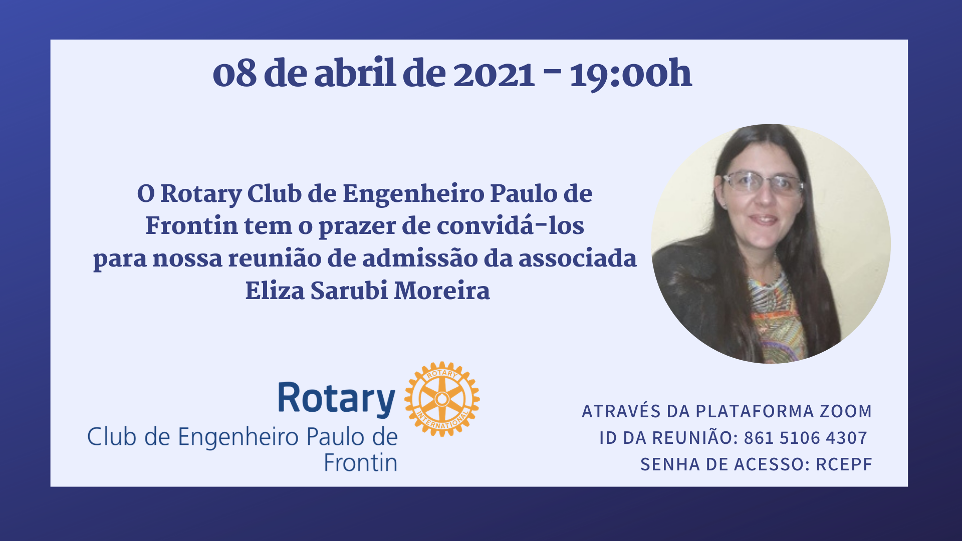Eliza Saburi Moreira seja bem-vinda, companheira! Esperamos que o Rotary Club de Engenheiro Paulo de Frontin se torne a sua casa por muitos anos e que encontre em todos nós uma segunda família.