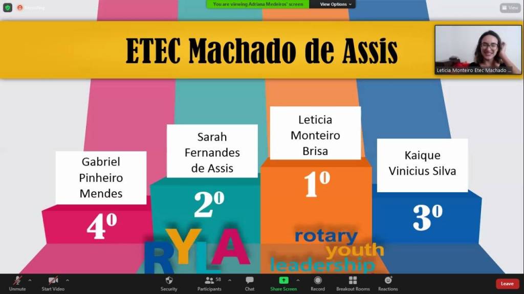 A estudante Leticia Monteiro Brisa, da ETEC Machado de Assis, de Caçapava, se destacou dentre os demais participantes pelo seu envolvimento e participação no RYLA.