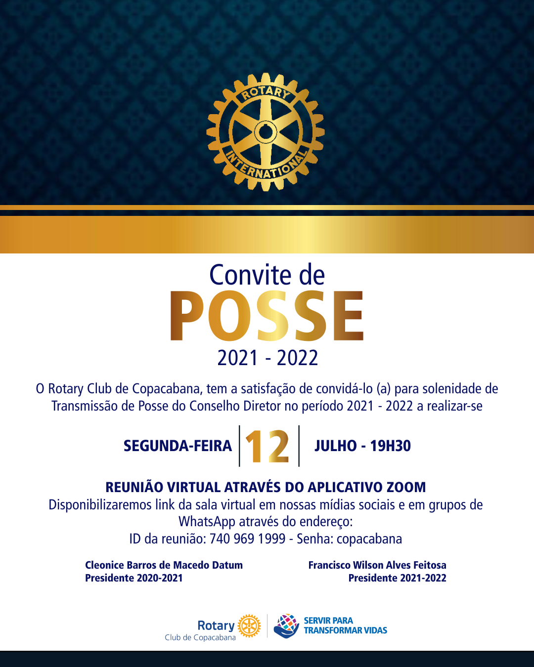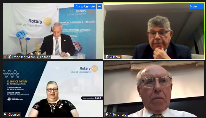 Em cerimônia de Posse do Novo Conselho Diretor, a Pres. 2020/21 Cleonice Datum encerra brilhantemente seu período, passando a liderança do Clube ao Pres. 2021/22 Francisco Wilson de A. Feitosa. O evento contou com a presença de muitos governadores, presidentes, governadres assistente, amigos e companheiros que o RC de Copacabana coleciona como amigos-irmãos. Juntos, puderem assistir a homenagem póstuma a personalidades importantes para o Clube, deram as boas-vindas ao Pres. 2021/22 Francisco Wilson A. Feitosa e aos companheiros do Conselho Diretor, empossados por ele na noite de hoje.