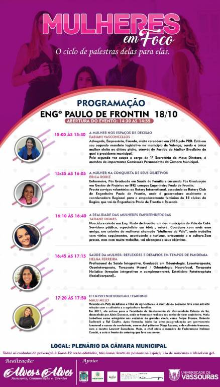 Podemos dizer, Mulheres em Foco, um ciclo de palestras delas para elas foi um grandioso e enriquecedor evento, especialmente para o público feminino. Foram ofertadas cinco palestras por evento, contemplando os municípios de Engenheiro Paulo de Frontin, Barra do Piraí, Mendes e Vassouras, nesta primeira etapa do ciclo de palestras. Reconhecemos que todo e qualquer evento, seja de menor ou maior porte, não se realiza por esforço, empenho e trabalho de apenas uma ou de um grupo de pessoas, mas da união de dezenas delas com diferentes e diversos olhares. Desta forma, parabenizamos cada uma das palestrantes, convidadas, parceiros, organizadores, patrocinadores e todos os profissionais envolvidos, pelo tempo disponibilizado e elevado empenho em prol deste evento, em especial o jornalista e editor da Revista “Mulheres em Foco” Aridalto Alves. Agradecemos aos palestrantes pela preocupação e cuidado em preparar carinhosamente aquilo que há de mais relevante e atual nas temáticas apresentadas, uma visão ampla de problemas aos quais são confrontadas as mulheres Agradecemos a oportunidade de apresentar o programa de Empoderamento Feminino do Rotary International pela companheira Erica Roriz coordenadora da Região C do Distrito 4.571 de Rotary International . No sábado (23) foi sediado o encerramento desse Ciclo no Centro de Convenções General Sombra, na cidade de Vassouras, cidade dos Barões no Vale do Café , sul Fluminense do Estado do Rio de Janeiro.