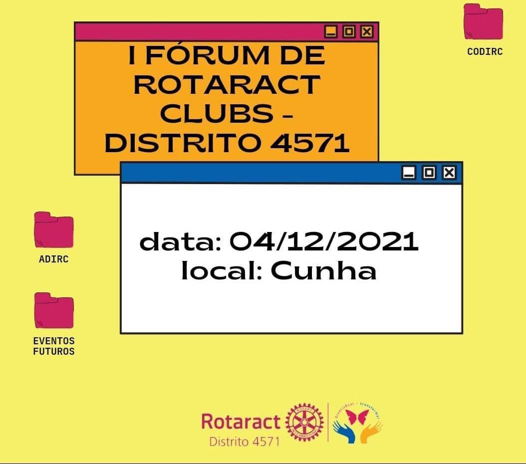 No próximo dia 04/12/2021, sábado, os Rotaractianos do Distrito 4571 se reunirão em Cunha/SP para realização do I Fórum de Rotaract Clubs - Distrito 4571. O evento será na Escola Estadual Paulo Virgínio e será uma oportunidade de discutir assuntos relacionados à condução dos trabalhos dos rotaractianos e terá o seguinte cronograma: