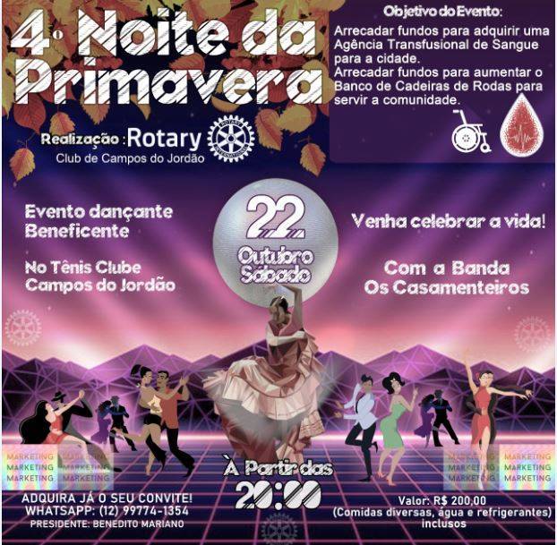 4ª Noite da Primavera – Evento dançante beneficente, que será realizado no Tênis Clube de Campos do Jordão/SP, no dia 22/10/2022 à partir das 20:00.
