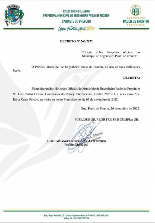 O Rotary Club de Engenheiro Paulo de Frontin recebeu no dia 03 de novembro, o Governador do Distrito 4571 do Rotary Internacional, Luiz Carlos Fávaro e sua esposa Kátia Xagas Fávaro, para se inteirar sobre o trabalho do clube em suas atividades junto à comunidade e ao Distrito.