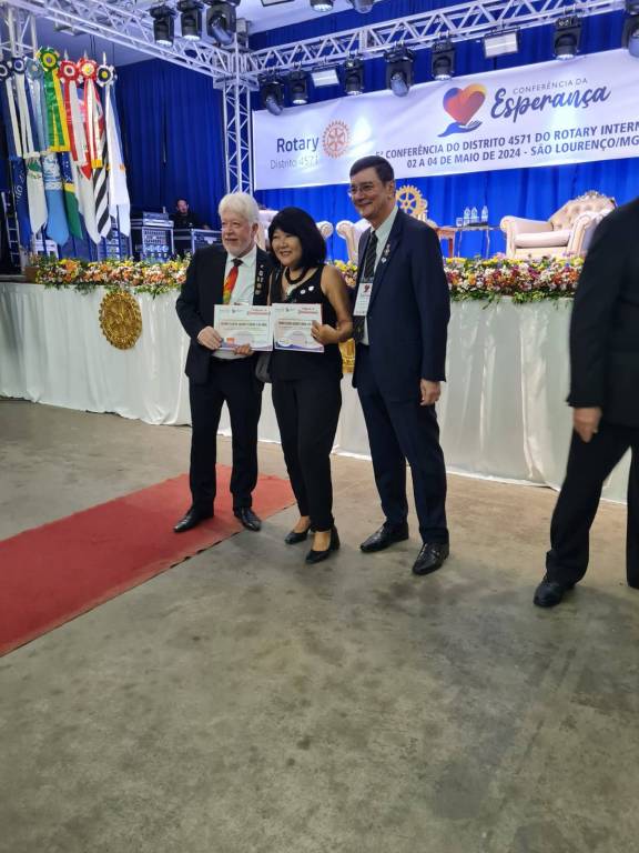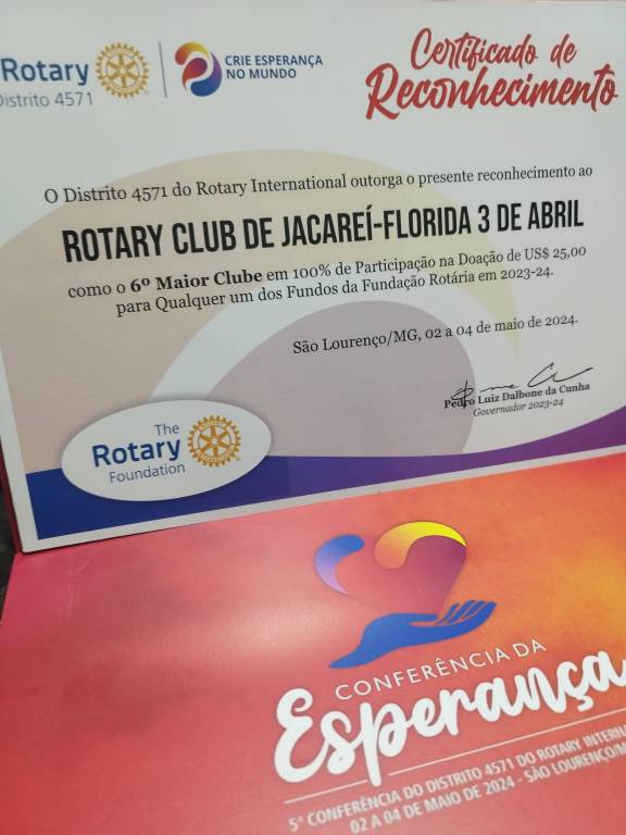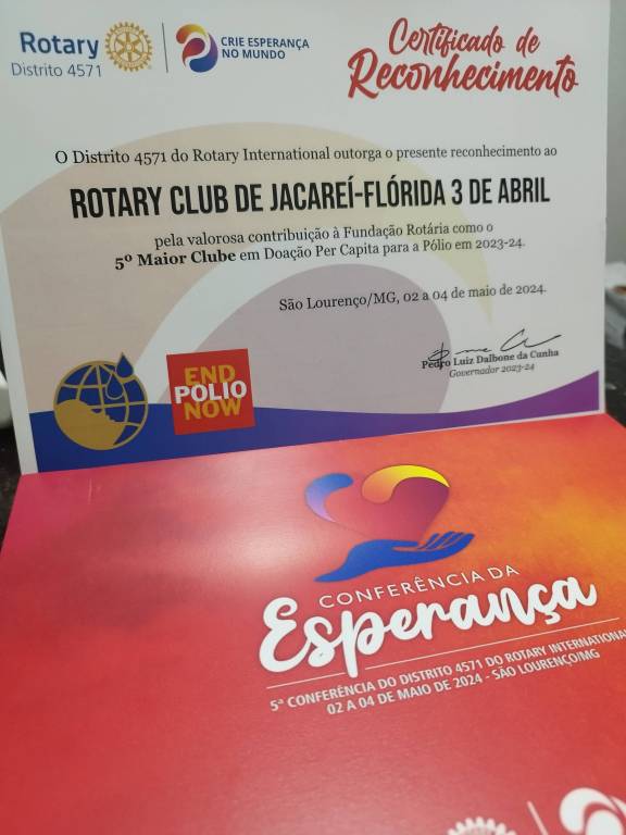 Neste evento, recebemos um total de 5 menções em reconhecimento aos trabalhos realizados pelo Clube como : 5° Maior Clube em Doação Per Capita para a Pólio, 6° Maior Clube com 100% de Participação dos associados em doação à Fundação Rotária, Reconhecimento ao compromisso com as metas do distrito, Club 100% Pólio Plus e dedicação ao presidente 23/24 Fernando Fahihb.