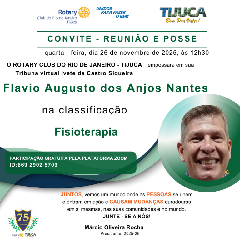 "O Rotary em Minha Vida" é o tema da reunião do Rotary da Tijuca de quarta-feira, 26 de novembro, às 12:30hs, apresentado pelo Advogado Paulo Eduardo de Barros Fonseca, Diretor Indicado de Rotary International período 2027-2029, e a admissão do companheiro Flávio Augusto dos Anjos Nantes, ocpuante da alsccificação Fisioterapia. Acesso gratuito pelo link https://us02web.zoom.us/j/86929025709 Estejamos unidos para fazer o bem e da Tijuca,um bom lugar para se viver. Junte-se a Nós!