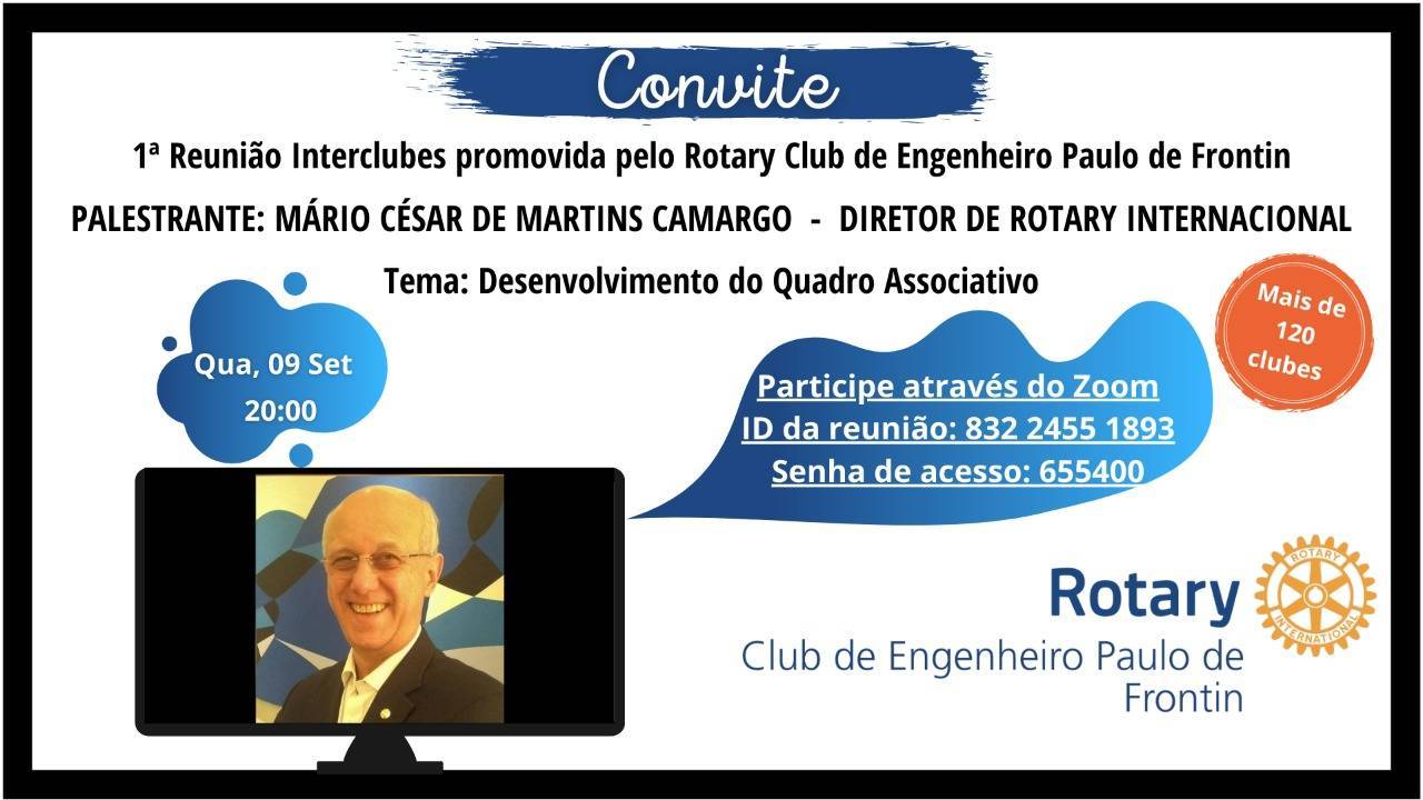 Os companheiros do Rotary Club de Engenheiro Paulo de Frontin distrito 4571 e mais 123 clubes no vídeo citados se unem em uma grandiosa reunião inter clubes para ouvir a palestra sobre "Desenvolvimento do Quadro Associativo" proferida pelo Diretor de Rotary International Mário César Martins de Camargo dia 09 de setembro de 2020 às 20:00. Para facilitar o controle de entrada na sala de reuniões por favor preencham o formulário de inscrição. https://forms.gle/ebFHSRYkXBTURg8cA