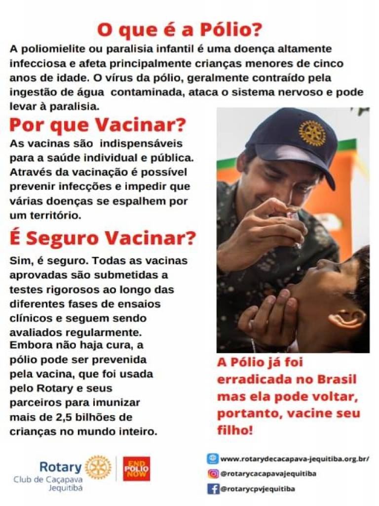 O material informativo foi elaborado pela Comissão de Imagem Pública do Rotary Club de Caçapava-Jequitibá, com apoio da Comissão Distrital de Imagem Pública, e traz informações e imagens obtidas do My Rotary e do portal Endpolio.org.
